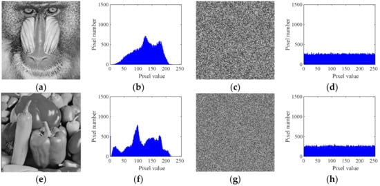 where represents the information source and represents the probability of occurrence. According to the maximum information entropy principle, when each has an equal probability, i.e., , the information source has the maximum information entropy . For the information source of an 8-bit gray-scale image, there are 256 gray levels and n = 256. Therefore, the maximum information entropy that can be reached by the gray-scale image is = 8. Therefore, the closer the information entropy of an encrypted image is to 8, the stronger its uncertainty and the higher its security. The information entropy of various standard test images encrypted by this algorithm and some recently published algorithms are listed in Table 7. The results show that the information entropy of ciphertext images is very close to the ideal value of 8. Moreover, compared with other algorithms, the images encrypted by the proposed algorithm have more advantages in many cases.