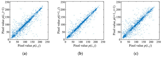 The distribution of adjacent pixel values for image Lena is plotted in Figure 10, which can intuitively display the correlation between adjacent pixels. As can be seen from Figure 10, the adjacent points of the original Lena image are distributed on or near the 45 degree line, indicating that the values of adjacent pixels are equal or close. However, the adjacent points of the ciphertext image are not concentrated on the 45 degree line, indicating that there is a large difference in the values of the adjacent pixels. Therefore, the encryption algorithm effectively breaks the pixel correlation of the image.