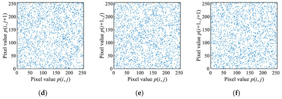 Correlation point diagrams of plaintext image Lena and encrypted image Lena. (a) Original Lena in horizontal direction, (b) Original Lena in vertical direction, (c) Original Lena in diagonal direction, (d) Encrypted Lena in horizontal direction, (e) Encrypted Lena in vertical direction, (f) Encrypted Lena in diagonal direction.