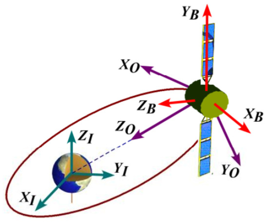 For representing the orientation of a rigid body in 3D space, three coordinate frames, depicted in Figure 1, are usually adopted. Here, the orbit reference, the inertial, and the body-fixed frames will be respectively represented by , , and . Let be the modified Rodriguez parameters (MRPs) for the rigid spacecraft with respect to and refers to the inertial angular velocity with respect to and described in . Therefore, the rigid spacecraft equations of motion can be described as [2]