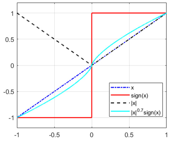 In this paper, to provide fixed-time convergence of the system states, we have used the function which is defined as where denotes the standard sign function. It is worth mentioning that the function used in the proposed control scheme is not a discontinuous function. In Figure 2, this function for has been compared with the functions x, , and . As can be seen, the function is continuously differentiable.