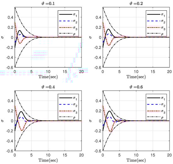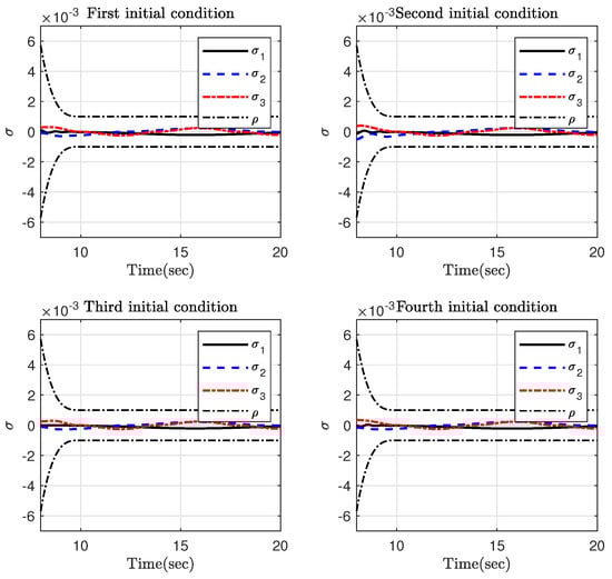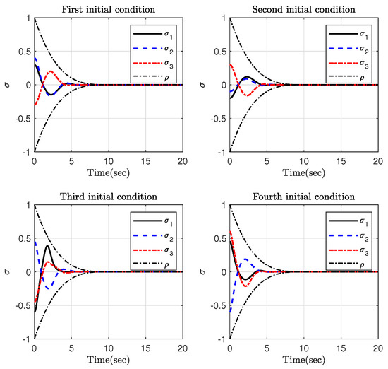 The simulation results are depicted in Figure 12, Figure 13 and Figure 14. It is clear that the attitude trajectory can be closer to the boundary of the permitted region if the parameter is not too small. The reason behind this fact is that if the initial value of the attitude attitude satisfies , then we have . Hence, for the same value of , a smaller results in a bigger . Therefore, is closer to 1 and the time-varying gain becomes bigger in this case and the system trajectory is not allowed to become close to the boundary of the FTPPF.