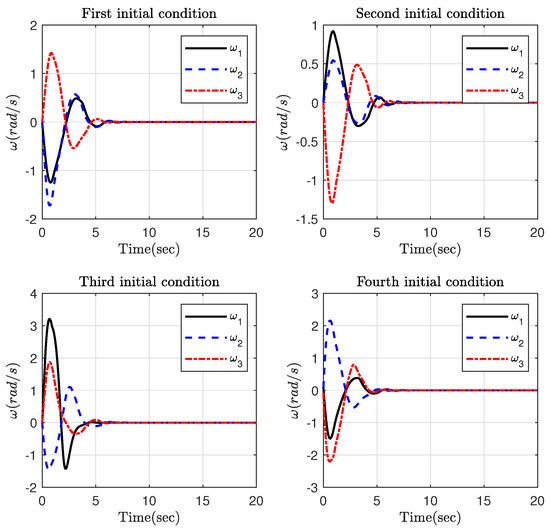 Time responses of the rotation velocity in Part 1 for different initial conditions.