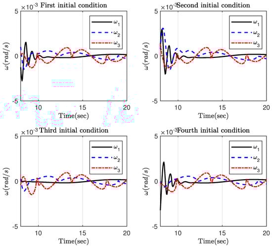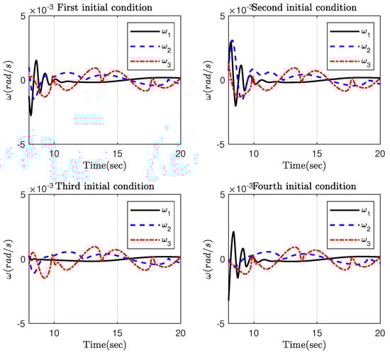 Part 3: The main objective of this part is to evaluate robustness of the proposed control scheme with respect to time-varying disturbances including high and low frequencies and measurement noises. To this end, it is supposed that the space disturbance is [54]. As can be seen, the disturbance is composed of low- and high-frequency signals. Moreover, additive states noise with a standard deviation is added to the attitude and angular velocity before measurement to produce noisy measurements. Given the measurement vectors, the noise is added in the form of white Gaussian noise with zero mean and standard deviation [55]. The simulation results have been provided in Figure 15, Figure 16, Figure 17, Figure 18 and Figure 19. More specifically, Figure 15 and Figure 17 show that the attitude and angular velocity are stabilized in the presence of measurement noise and high-frequency disturbance. Looking at the time response of the attitude and angular velocity in Figure 16 and Figure 18, it is observed that the constraint imposed on the attitude is still satisfied and the proposed control scheme shows a satisfying performance with respect to measurement noise and high-frequency disturbance. Figure 19 presents the control torque. It is observed that the maximum required control torque is still in the acceptable range, but it shows some oscillations to suppress the negative effect of the measurement noise.