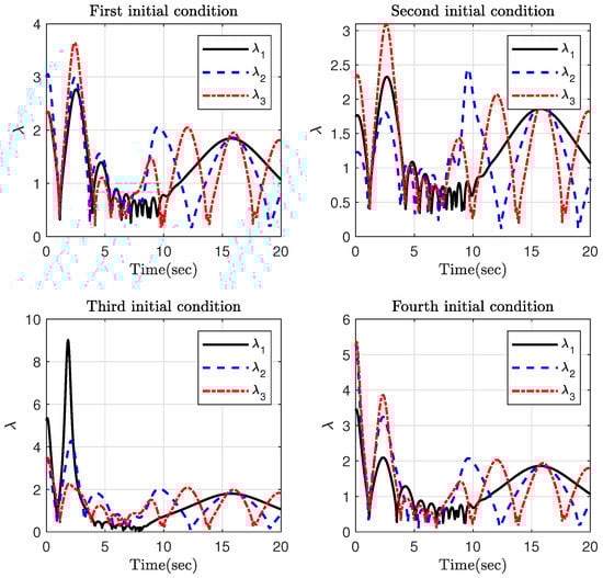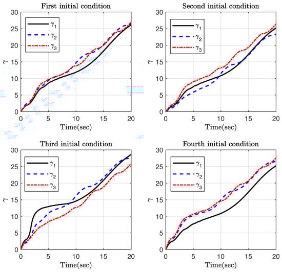 Part 2: In the previous part, the effect of different initial conditions on the time response of the attitude variable was investigated. Based on the definition where , it is observed that the parameter plays an important role in the value of the time-varying gain . Therefore, the impact of this parameter is evaluated in this part. The initial condition is taken as , and . The parameters of the controller, the update law, and the FTPPF are the same as in the previous part except for . Here, various values for are considered as (1) , (2) , (3) , and (4) .