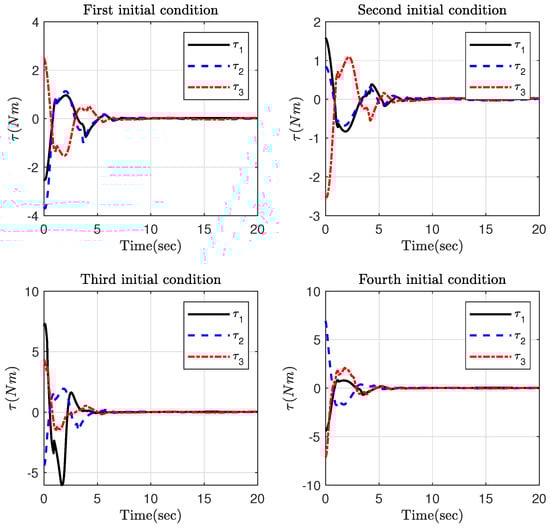 The control torque in Part 1 for different initial conditions.