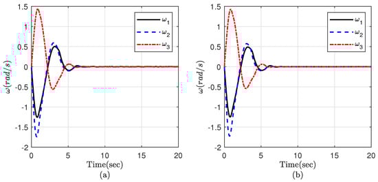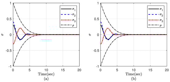 The simplicity of the structure of the controller designed in this paper is due to the use of a time-varying gain in the sliding surface instead of using complicated constrained control approaches such as prescribed performance control [37,38,39,40]. In these works, to constrain the spacecraft attitude, a new variable is employed to convert the constrained attitude system into an equivalent unconstrained one. Then, the system dynamics will be rewritten based on the new transformed variable. It is proved that robust stabilization of this variable is equivalent to satisfying the constraint on the spacecraft attitude. However, the control inputs in [37,38,39,40] contain partial derivatives and intricate terms as a result of stabilizing the transformed error. This, in turn, makes the control design procedure and the controller structure quite complicated.