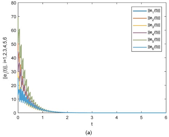 The initial values of networks are produced stochastically from [−50, 0]. By the fourth-order Runge–Kutta technology, the simulation results of Corollary 1 can be seen in Figure 2. Figure 2a displays the time evolution of through the effective matrix M, which demonstrates that the response system (23) can achieve synchronization with (22) by using delayed impulsive control. In case there exists some change for the gain matrix , which breaks the corresponding conditions, then Figure 2b shows the synchronization target between the drive system (22) and the response system (23) cannot be achieved.