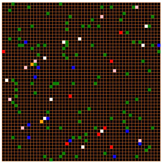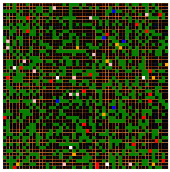 - Scenario 1: Observation of the randomness of the approach.We observe the randomness of this approach while trying to present different simulations while keeping the same information, and from there we can clearly see that contrary to the EBM model, several simulations starting from identical INPUTS can produce quite different results. Thus, starting from the initial situation of 204 individuals including 2 infected and 2 asymptomatic, we present below some executions of the model at time , in a radius of 5, with green: susceptible, yellow: exposed, red: infected, pink: asymptomatic, blue: RPT, white: RWT.
