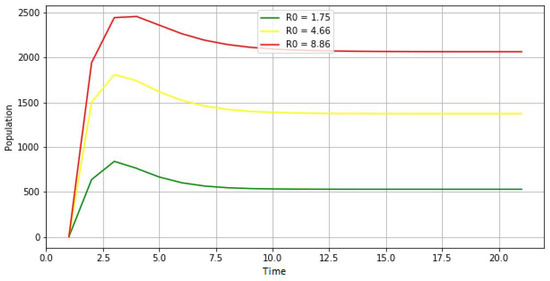 - Second scenario: Variation of the number of infected people as a function of .We can also see the progression curve of the disease as a function of the basic reproductions number (), to see its impact on the dynamics of the epidemic.