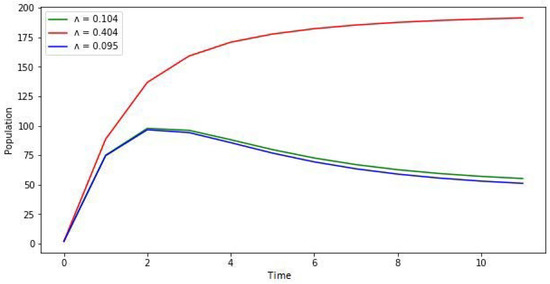 Progression of the infected individuals according to the parameter . Blue color: , blue color: , and red color: .