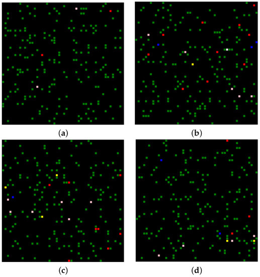 Based on the results obtained, we note that the disease dynamics follow a completely stochastic behavior, where at each execution of the performed simulation, there are different observations such as Figure 8a that represents the initial situation, Figure 8b gives us 0.49% of exposed, 4.9% of infected, 2.45% of asymptomatic, 1.47% of RPT, 0.49% of RWT, Figure 8c gives us 1.47% of exposed, 3.9% of infected, 2.9% of asymptomatic, 0.49% of RPT, 0% of RWT, and Figure 8d gives us 0.98% of exposed, 1.47% of infected, 1.96% of asymptomatic, 0.98% of RPT, 0% of RWT. The aspect of things verifies the random character of the model. We have also observed one of the very important parameters of the agent modeling, which is the radius, because it is an ABM modeling that establishes a detailed study on the inter-individual contact and we clearly see that although enjoying a random behavior, the radius can impact the pace of the propagation. Therefore, we have analyzed at the same time , the dynamics of the mixed population through different values of radius. We clearly notice with Figure 9, Figure 10 and Figure 11 that when the radius of contagion is small, the disease takes a long time to settle in the population.