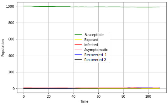 - First scenario: Global dynamicsIn this first experiment, we present the global dynamics of the disease as a function of the basic reproduction number (). With the baseline parameters presented in Table 3 above, we have a value that is close to the average value obtained in [23] based on COVID-19 data from China in early 2020.