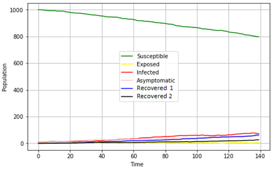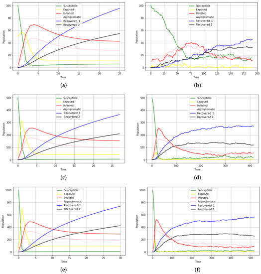 Figure 12a,c,e represent simulations of the equation-based model. The model is deterministic. Figure 12b,d,f represent simulations from ABM. This model is stochastic. Table 5 presents experiment results carried out using a computer with the following characteristics: ACER Aspire E5-571, Intel(R) core i3, with 4 × 1.7 Ghz CPU, and a 4096 MB RAM.