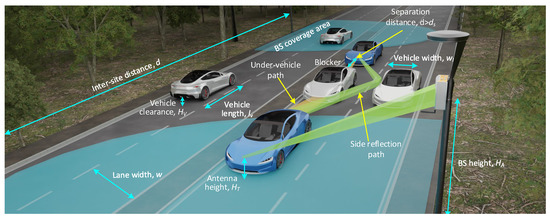 We consider highway deployment of sub-terahertz 6G BSs as shown in Figure 1. We assume that the BSs are deployed on both sides of the road at the constant height . To reduce CAPEX, it is possible to use existing road infrastructure, e.g., lamp-posts. We denote the road length between two adjacent BSs by d, the number of lanes in both directions by , and the lane width by w. Observe that BSs form isosceles triangles with the base of and height . We also assume that the speed of the vehicles is constant and equals v km/h, while their positions along the lanes follow the shifted Poisson process of intensity . The shift is introduced to reflect both the vehicle length and minimum separation distance required for safe driving of automated cars or dedicated control systems [13].
