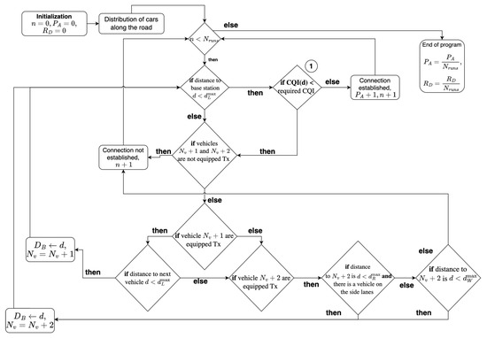 Algorithm 1 proceeds as follows. We start with the parametrization of our model and the definition of output parameters. At step 1, we introduce the critical distances of communication paths. Then, we allocate the vehicles on the road employing distance distribution (7) until the next vehicle gets over the segment of interest (steps 4–6). First, at steps 8–12, we check if there is an LoS path between the current vehicle and the BS, and if it is reachable, the bridge is established. Otherwise, the possibility of a relay is validated in steps 13–15, and if the bridge is blocked, it is considered unavailable. Within the next steps, we define the appropriate propagation paths of the hops. At steps 16–21, the vehicle attempts to find a LoS path toward a relay. If it is not feasible, the availability of a side reflection on the adjacent lanes is considered (steps 23–25). When neither LoS nor side reflections are available, the algorithm evaluates the channel quality through the front and rear glasses of the blocking vehicle (25–25). Having completed trials, at step 34, we finally calculate the metrics of interest. Alternatively, the algorithm is schematically presented in Figure 3.