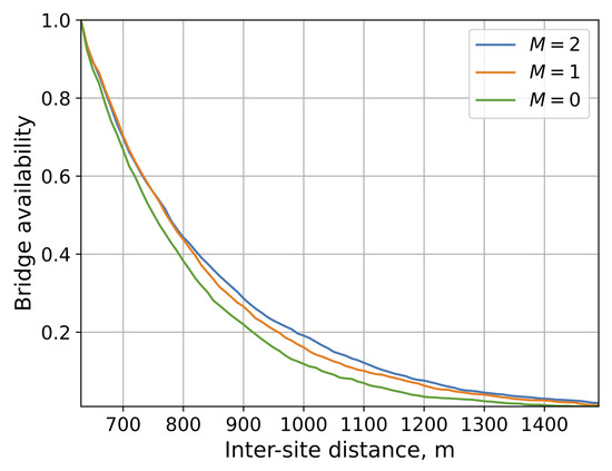The maximum allowed number of hops is another system design metric. To this aim, Figure 6b shows the bridge availability as a function of the ISD for the different maximum number of hops in normal traffic conditions () for the FO strategy. By observing the data, we note that linearly increasing the maximum number of hops results in an almost linear increase of the bending point, where the bridge availability starts to sharply drop. Still, as one may notice, the impact of the maximum number of hops is of secondary importance compared to the vehicle density for large targeted values of bridge availability. This is because even allowing for just a few hops allows for reliable bridge extension for small distances. However, as the number of allowed hops becomes larger, the whole “ad hoc” construction becomes fragile, reducing the considered metric. The number of lanes is even of less importance as evident from Figure 7 illustrating the bridge availability as a function of ISD for different values of M. Recall that typically corresponds to the highway scenario with multiple lanes, to the rural road, while to the case on one-way roads. Here, the difference between the three considered cases is minimal barely reaching a few percent between and . The rationale is that side-reflections are not that heavily utilized as compared to other propagation paths resulting in a small impact of M.