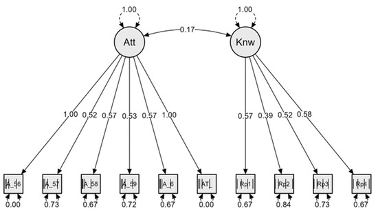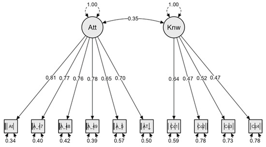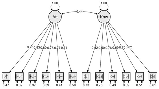 The reliability analysis of internal consistency was calculated using the coefficient of McDonald’s omega and Cronbach’s alpha on both of the two components (“Attitudes” and “Knowledge/Ability”) and on the total test. The results of the “Attitudes” component and the complete test indicated a good level of reliability (>0.80) for both statistics. However, in the “Knowledge/Ability” component, the values presented were not so good, especially in the omega McDonald statistic (Table 10).