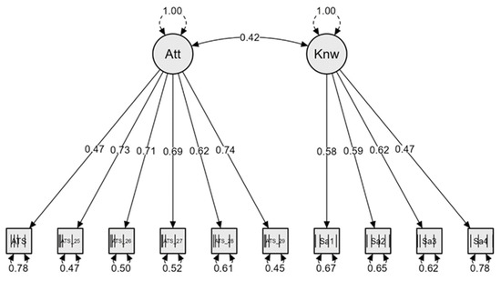 With the other part of the sample, the CFA [70] was carried out to verify what the EFA yielded: two factors, for the items of “Knowledge/Capacity” and “Attitude” of the different areas of digital competence. As can be seen (Table 9), all the values obtained in the goodness adjustments for each area were very positive [71,72].