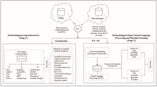 A two-stage methodological design is established: Stage 1 incorporates informetric analysis. This type of analysis is considered methodologically broader than bibliometric and scientometric studies. This strengthens the possibilities of analyzing phenomena and processes of different kinds, applying quantitative methods, and presenting descriptive characteristics, such as level of productivity in publications, scientific collaboration, and thematic structure, among many other characteristics [39].
