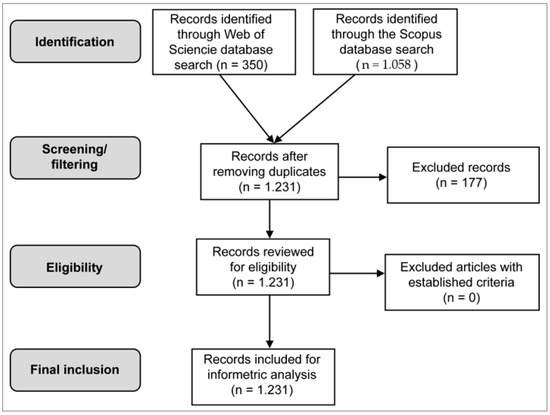 The TS and TITLE-ABS-KEY field codes retrieved the records used, including the titles, abstracts and keywords of the documents. The document typologies were “article”, “review”, “conference paper” or proceedings papers. The 350 and 1058 records retrieved from Web of Science and Scopus, respectively (see Figure 2), were exported to EndNote, which enabled duplicates to be removed and the subsequent single database with 1231 documents to be created. Quality control of the documents was then carried out in accordance with the objectives of the study.