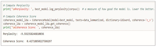 | Linear regression | The confusion matrix; Recall, F1-Score;Area under the curve (AUC) | Latent Dirichlet approach (LDA) | Perplexity; Coherence |