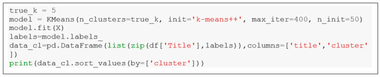In the same methodological approach, Python libraries for clustering analysis were applied to the analysis of scientific production. The clustering technique is possibly the best-known unsupervised ML method [32], in which each element of a dataset is assigned to one or more automatically identified clusters. The clustering technique has been used, for example, to group the category results from web searches or for hierarchical clustering, where some clusters are contained within other clusters listed as higher-level concepts [33]. Some clustering algorithm approaches make it possible to characterize each group in relation to domains of interest. In this sense, groups can be named automatically, allowing people to understand similar elements within a given group. In fact, a text clustering resulting from an automated system analyzes the distribution of terms (words) in a body of text (e.g., titles and abstracts) and identifies groups of documents that use similar combinations of words; clustering “engines” often apply a descriptive term to each group to aid human interpretation [34,35]. The usefulness of each cluster label may vary depending on the algorithm’s approach: data-focused algorithms focus on clustering text, and this is where K-means methods that vectorize the text contained in BOW are common.