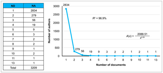 The term “informetrics” had its beginnings in the field of information science in the 1980s. In 1987, the International Conference on Bibliometrics and Theoretical Aspects of Information Retrieval was held in Belgium. It suggested the inclusion of this term for the next conference to be held in London in 1989. The introduction of the word “informetrics” is attributed to the German Otto Nacke, who first used it in 1979 [29] At first it was only known as a general field of study that included elements of the earlier bibliometrics and scientometrics. Informetrics builds on the research of bibliometrics and scientometrics, and encompasses issues such as the development of theoretical models and measures of information, to find regularities in the data associated with the production and use of recorded information; it encompasses the measurement of aspects of information, storage and retrieval, and therefore, includes mathematical theory and modulation. Indeed, a descriptive study with informetric methodology examines the scientific production of competencies and professional skills in the field of BI&A knowledge in organizations. To achieve this purpose, we analyzed the evolution of scientific production, the productivity of authors according to Lotka’s Law, the most productive journals, the analysis of the co-authorship map, and the co-occurrence of keywords to identify thematic trends. Lotka’s law is a statistical observation offered by Alfred Lotka (1926) that describes a quantitative relationship between authors and articles produced in a given field and time period. In this sense, when Lotka’s law is applied in this study, it shows that there is an uneven distribution, since most of the articles are written by a small portion of highly productive authors. Indeed, the number of authors who publish papers on a subject is inversely proportional to the square of n: , where represents the number of papers by a given number of authors, is the number of papers produced by a single author and is the number of authors of the papers, so we apply the law of exponential growth squared [30].