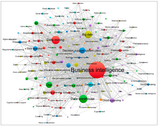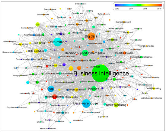 The results of the keyword network analysis of the scientific production (Figure 14) show that the most recurrent groups of central themes are business intelligence, data mining, data warehouse, big data and olap, and show consistency with the results obtained from the application of the unsupervised algorithmic technique (LDA) (Figure 6), which picked out analytical capacity, prediction and big data. Likewise, the thematic evolution having the highest presence between 2012 and 2018 (Figure 15), when applying the informetric techniques, resulted in the following themes: database, decision support system and association rules (2015); data analytics, analytics, business analytics and cloud computing (2016); clustering, big data, big data analytics, predictive analytics and case study (2017); and machine learning. Indeed, these themes are entirely consistent with the findings from the results of the text clustering algorithm, confirming the pattern of clusters of study themes into big data, data modelling and analytics and BI in general (Figure 17).