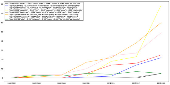 With regard to the results of our study applying machine learning (ML) and natural language processing (NLP) techniques, eight topics were identified with good scores, which were focused on empirical industrial domains focusing on unstructured big-data processing oriented towards the company, market and customer. The other topics discovered (5 and 6) can be said to be oriented towards predictive analytical techniques and studies of a company’s technological infrastructure and architecture to support the evolution of BI&A, and these topics (8 and 0) very likely emerged due to the COVID-19 changes. On the one hand, BI&A techniques relate to health issues, and on the other hand, to logistics and distribution.