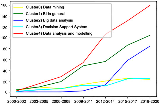 The results of the main clusters, after the application of k-means clustering (stage 2), with respect to scientific production over the last twenty years, showed a group that stands out: clusters 4, 1 and 2 can be located within topics 5, 7, 12 and 16. It shows the same behavioral pattern of scientific interest focused on empirical industrial domains, such as unstructured big-data processing with orientations towards business, market and customer data analytics (Figure 11).