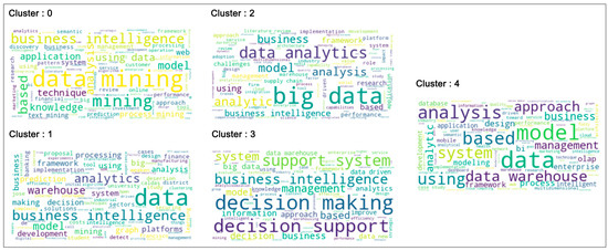 - The second unsupervised machine learning algorithm was applied to a grouping of texts in order to analyze the main clusters resulting from the 1231 articles considered. The aim was to analyze the results of the k-means model trained to predict the type of cluster belonging to each article related to each of these and to analyze the resulting pattern of the most relevant scientific production with respect to the emphasis on the dimension of strategic leadership competencies in BI&A and its relationship with the competence domains.