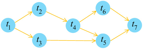 Figure 1 provides an intuitive example of a DAG model for a workflow having seven tasks, i.e., . The edge represents the data dependency between and , meaning that the start of task needs to wait for the output result of task . As can be seen in Figure 1, for task , the set of its immediate predecessors is , and the set of ’s immediate successors is .