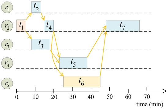 To improve readability, we take the workflow in Figure 1 as an example to visually illustrate the decision variable and the calculation of the corresponding objective vector. Assuming that the resource set is , one decision variable of the workflow with seven tasks in Figure 1 is . The configurations of the five cloud resources and the execution time from tasks to resources are summarized in Table 1. The data transmission time among workflow tasks is given in Table 2. Based on the above assumptions, Figure 2 illustrates the Gantt chart of the schedule. Then, we can calculate each workflow task’s start and finish time, which is given in Table 3.