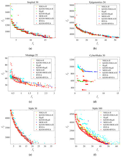 In Figure 6, the populations obtained by the algorithms using the proposed KEOO are shown in red, and different algorithms are distinguished by different icons. The first impression of the six sub-figures is that the red icons are distributed at the forefront. This indicates that the proposed KEOO improves the existing multi-objective evolutionary algorithms on both makespan and economic cost. These comparison results are consistent with those in Table 5. The population distribution of the variant with the proposed KEOO is basically consistent with that of the original algorithm. This is because they all use the same environmental selection operator. The advantage of the four variants is that they employ the task consolidation mechanism to reduce economic cost, and the critical task adjustment mechanism to reduce makespan and economic cost simultaneously.