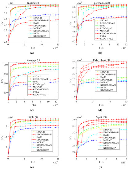 Change of hypervolume values with the advance of evolution. (a) on Inspiral with 30 tasks; (b) on Epigenomics with 24 tasks; (c) on Montage with 25 tasks; (d) on CyberShake with 30 tasks; (e) on Sipht with 30 tasks; (f) on Sipht with 100 tasks.