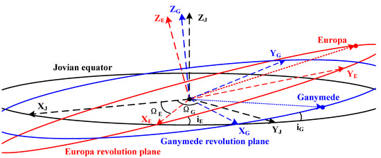 where a, e, I, Ω, ω, and f are semi-major axis, eccentricity, inclination, longitude of the ascending node, argument of periapsis, and true anomaly, respectively, which constitutes the set of orbital elements oe, oe = [a, e, i, Ω, ω, f]. The symbol u is defined as the argument of latitude, u = ω + f. Particularly, the orbital elements without subscript denote the orbit of the probe in the ECI coordinate system. The subscripts “E” and “G” represents the orbital elements of Europa and Ganymede in the JCI coordinate system. is the difference of longitude of the ascending node between Ganymede’s and Europa’s revolution orbits, . The detailed expressions of variables K1 and K2 are given in Equations (35)–(39) of Appendix A.