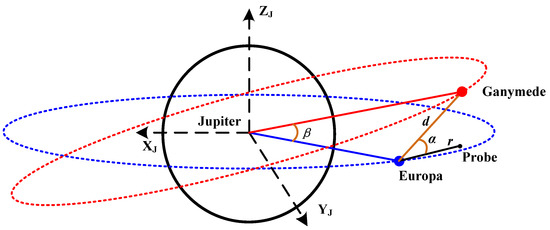 Moreover, the relative positions between Jupiter, Europa, Ganymede, and the probe are illustrated in Figure 2. The angle α is the angle between the distances r (the distance between the probe and Europa) and rEG (the distance between Europa and Ganymede). Meanwhile, angle β defines the angle between the distances rEJ (the distance between Europa and Jupiter) and rJG (the distance between Jupiter and Ganymede). Consequently, distance rGP, from Ganymede to the probe, is determined by distances r, rJE, and rJG, as well as the angles α and β, which can be calculated in a simple trigonometric way as follows: