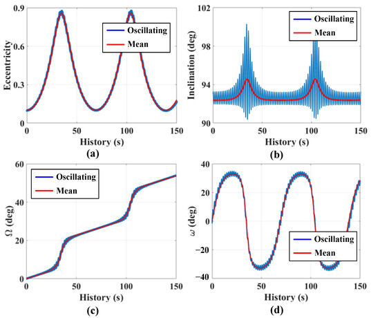 To validate the long-term evolution behavior based on the double-averaging method, a large-eccentricity, high-inclination orbit is taken as an example to simulate the orbital behavior under the accurate average model. The adopted values of the gravitational parameters of Jupiter, Europa, and Ganymede are given in Table 1. The initial orbital conditions of the probe are set to for a = 1.2 RE, i = 93°, Ω = 0°, and ω = 0°, unless otherwise specified in the following simulations. Eccentricity e = 0.1 is selected, and the evolution duration is set as 150 days. The orbital evolutions of the eccentricity, inclination, longitude of the ascending node and argument of periapsis are given in Figure 3. Blue and red curves represent the oscillating and mean orbits, respectively. Note that the semi-major axis remains constant and is not propagated.