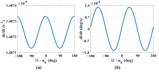 Based on the long-term models in Equations (21)–(25), the effects of Ganymede’s gravitation on the orbital elements with respect to the initial phase angle are studied. This initial phase angle is the difference between the initial longitude of the ascending node and the argument of latitude of Europa, i.e., Ω − uE. The average rates of change of the eccentricity and inclination are shown in Figure 4. The initial conditions of a near-circular orbit are considered by setting e = 0.001, ω = 35°. The average rates of change are propagated using the numerical integration method. From Figure 4a, it can be seen that the oscillation amplitude was four orders of magnitude smaller than the value of the rate of change, which suggests that Ganymede’s gravitation perturbation on the eccentricity is weaker compared to those of Europa’s non-spherical gravitation and Jovian gravitation. According to the literature [11,13], the eccentricity evolution mainly depends on the inclination and argument of periapsis.