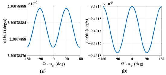 Moreover, the average rates of change of the longitude of the ascending node and argument of periapsis with respect to the initial phase angle Ω − uE are studied. The initial orbital conditions of the probe are e = 0.001 and ω = 35°. The calculation results are shown in Figure 5. Similarly, the average rates of change are propagated using the numerical integral method. According to Figure 5a, for the average rate of change of the longitude of the ascending node, the oscillation amplitude is eight orders of magnitude smaller than the value of the average rate of change. This means that Ganymede’s gravitation has little effect on the longitude of the ascending node. Meanwhile, the literature [11,13] shows that the semi-major axis and inclination determine the rate of change of the longitude of the ascending node when considering Europa’s non-spherical gravitation and Jovian gravitation perturbations. Therefore, to generate the Ganymede-synchronous frozen orbit, it can be assumed that the evolution of the longitude of the ascending node is decoupled with the initial phase angle Ω − uE to simplify the design of the initial orbital conditions.