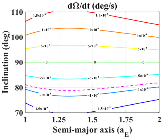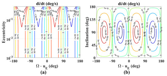 Then, the rate of change with respect to the inclination is shown in Figure 6b. According to Figure 6b, the rate of change of the inclination is divided into positive regions where the initial phase angle Ω − uE is (−180°, −90°) and (0°, 90°) and negative regions where the initial phase angle Ω − uE is (−90°, 0°) and (90°, 180°). Between these regions, the contour line of di/dt = 0 deg/sec is obtained (define this line as DIZL). Due to the fact that for the synchronous frozen orbit the initial phase angle Ω − uE and inclination keep constant, the rate of change of the inclination is fixed. Therefore, the initial condition should locate on the DIZL to achieve the frozen behavior.
