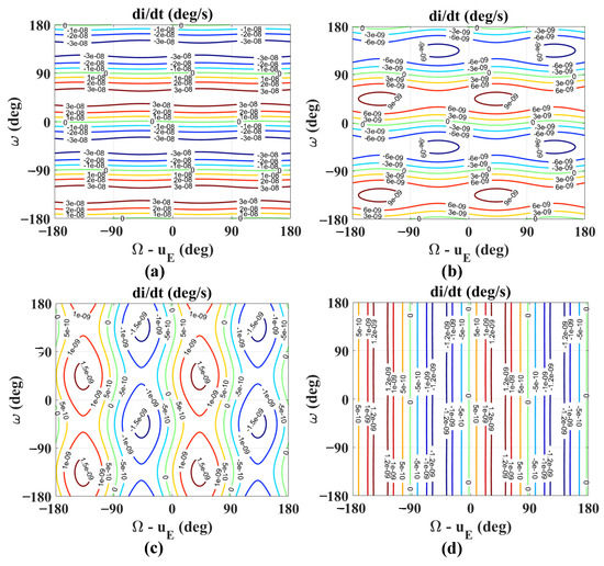 Finally, the rate of change of the inclination with respect to the argument of periapsis is analyzed. A series of eccentricities 0.1, 0.05, 0.01, and 0.001 are taken as examples to study the evolution of di/dt. The results are contoured in Figure 7 for e = 0.1 (a), e = 0.05 (b), e = 0.01 (c), and e = 0.001 (d). According to Figure 7a for eccentricity e = 0.1, the argument of periapsis dominates the rate of change of the inclination for an elliptic orbit. The DIZLs are discovered when the argument of periapsis is about −180°, −90°, 0°, and 90°. Figure 7b,c show the transition of di/dt between the elliptic orbit and the near-circular orbit. With the eccentricity descending, the effect of the argument of periapsis decreases. Furthermore, for a near-circular orbit in Figure 7d, this rate of change mainly depends on the initial phase angle Ω − uE. The initial phase angles Ω − uE of the DIZL are about −91°, −1°, 89°, and 179°. Therefore, when a near-circular Ganymede-synchronous orbit is considered, the initial argument of periapsis can be chosen arbitrarily.