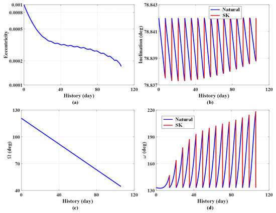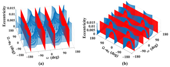 In addition, the literature [17] shows that a large velocity increment () is needed to freeze the eccentricity because of the drift of the argument of periapsis. A more cost-efficient way is to freeze the inclination and argument of periapsis. Meanwhile, the value of the argument of periapsis should be in the regions of (−90°, 0°) and (90°, 180°), where the eccentricity continuously decreases. In this situation, the orbit keeps circularizing and achieves a long lifetime. These frozen conditions are summarized as follows: