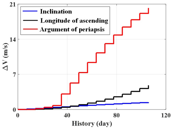 Furthermore, according to Figure 12, for about 105 days of evolution, the maintaining ∆V for the inclination, longitude of the ascending node, and argument of periapsis were 1.36 m/s, 4.8 m/s, and 20 m/s. The total ∆V consumption was about 26.16 m/s, which was 0.25 m/s per day. This is an acceptable ∆V for a practical mission. Most of the ∆V is consumed to maintain the argument of periapsis, while maintaining the inclination cost the least ∆V. This suggests that the effect of an accurate dynamic model has little influence on the evolution of the inclination.