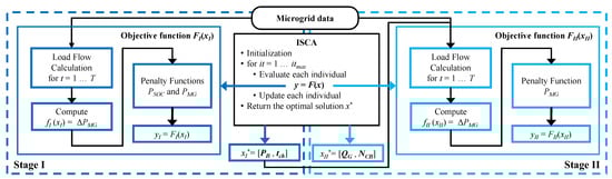 The active−reactive power coordinated optimization problem is solved by the optimization module in two consecutive stages, as the flowchart in Figure 1 shows. Firstly, the active power optimization is performed by applying ISCA or SCA for minimizing the penalized objective function FI(xI) by determining the optimal scheduling for the BESSs and EVs charging time. The results provided by the first stage xI*, consist of the BESS active power during the day PB and EV charging time tch. Afterwards, the objective function FII(xII) is minimized under the second stage by determining the optimal reactive power output of the DGs and CBs within the microgrid. The second stage input data consists of the microgrid operational data, including the results provided by the first stage. Finally, the second stage results xII* consisting of the DGs reactive power output QG and CBs operational steps are returned alongside the first stage results xI* as the solution to the OARPC problem.