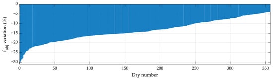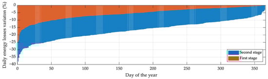 The daily energy loss variation between each stage of the OARPC and LARPC strategies is presented in Figure 15, expressed in percentage. The results reveal that the first OARPC stage reduces the daily energy losses by more than 20% during three days of the year, while for another six days the decrease is less than 0.2%. Furthermore, a 10% improvement in active energy losses is obtained for 53 days, while a 5% reduction is observed for 182 days. After the second stage, the OARPC reduces the active power losses between 3.1% and 37.9%, in comparison to the second LARPC stage. As the results show a 20% decrease is obtained for 113 days, while a 10% improvement is obtained for 275 days during the year. Finally, an annual average active energy loss reduction of 4.4%% is obtained after the first stage OARPC stage, and 15.2% after the second OARPC stage in comparison with the local strategy.
