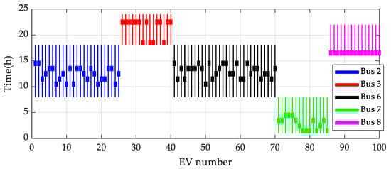 As previously mentioned, EVs are modelled as a fixed absorbed power during the charging time . The charging of the EV must commence after its arrival time at the charging station. Moreover, at the established departure time, the EV must reach its full battery capacity, therefore the time span between the charging starting point and departure time must cover the necessary charging duration .
