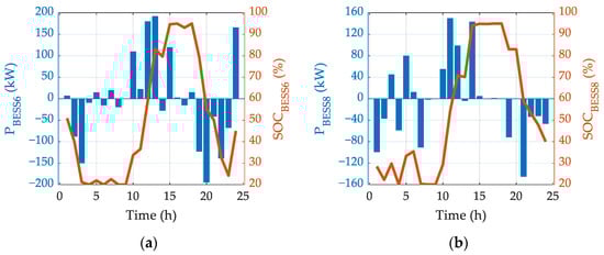 The optimal scheduling for the BESS connected at (a) bus 6 and (b) bus 8, determined after the first stage of OARPC for the selected day.