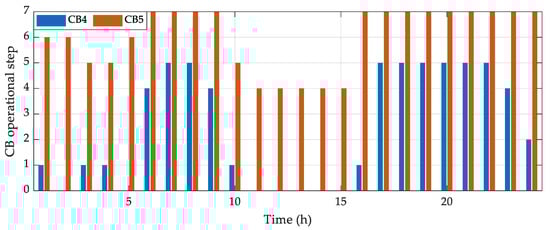 Figure 8 presents the reactive power output Qgen for the seven PVPPs and one WPP for the selected day. The results reveal that WPP generates reactive power during the morning and evening, with a peak of 315.8 kVAr during the 19th time interval, which coincides with the maximum reactive power demand of the day. Considering that the reactive power optimization is aiming at reducing active power losses, the reactive power flow through the microgrid lines will be minimized by encouraging the reactive power generation as close as possible to the loads. Therefore, during the mid-day hours, the reactive power support is mainly provided by the PVPPs. During this period of the day, the WPP absorbs a relatively reduced reactive power surplus of 32.3 kVAr. As Figure 9 shows, the capacitor banks are operating on the maximum steps, during the morning and evening demand peaks, while during the midday hours, CB4 is disconnected while CB5 operates on the 4th step, out of the maximum 7.